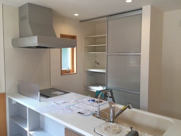 もうすぐ完成のS様邸にてキッチン背面の扉付き収納が設置されました!