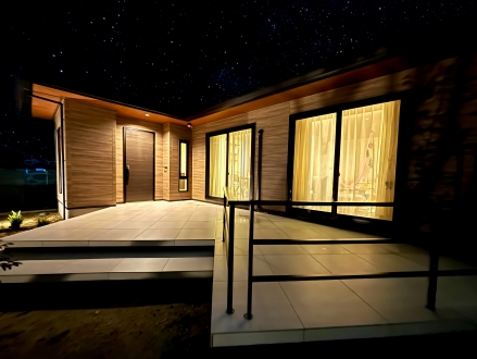 窓際には、間接照明を使った素敵な家族空間。こだわりの24時間換気システムや高性能サッシで夏は涼しく、冬は暖かく家族の健康にも寄り添った素敵な平屋です。