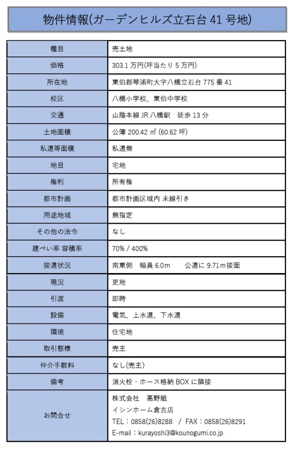 販売区画数 1区画 土地面積 200.42㎡(60.62坪) 価格 303.1万円 学区 八橋小学校、東伯中学校 交通 山陰本線JR 八橋駅 徒歩13分 建ぺい率 70% 容積率 400% 地目 宅地 引渡時期 即時 取引態様 売主 用途地域 無指定 建築条件 土地売買契約締結後3ヶ月以内に株式会社 高野組と建築請負契約を結んでいただくことを条件として販売いたします。