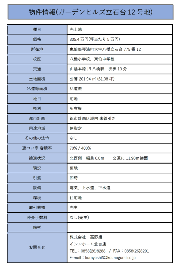 販売区画数 1区画 土地面積 202.59㎡(61.28坪) 価格 306.4万円 学区 八橋小学校、東伯中学校 交通 山陰本線JR 八橋駅 徒歩14分 建ぺい率 70% 容積率 400% 地目 宅地 引渡時期 即時 取引態様 売主 用途地域 無指定 建築条件 土地売買契約締結後3ヶ月以内に株式会社 高野組と建築請負契約を結んでいただくことを条件として販売いたします。