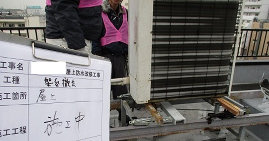 雪止め撤去・新設、室外機架台撤去・移設、キュービクル下鋼板撤去・新設をする。