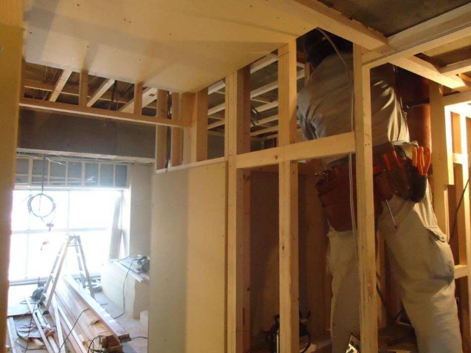 三郷市のハイラーク三郷リノベーション工事は天井、壁下地工事が完了しボード張り作業をしています。