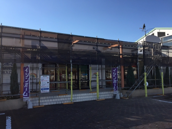 ただいま、陽南ショールームでは外観の塗装工事のため、入口付近に足場が組まれております。