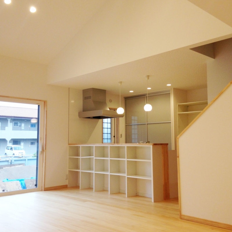 キッチンはI型でリビング側を向いて料理をすることできるようになっています。キッチンの裏側には、対面カウンター収納があり、子供達の勉強道具などを置いておくことも出来ます。カップボードは天井まで隠れたデザインで、内部にホコリがつきにくい作りになっています。