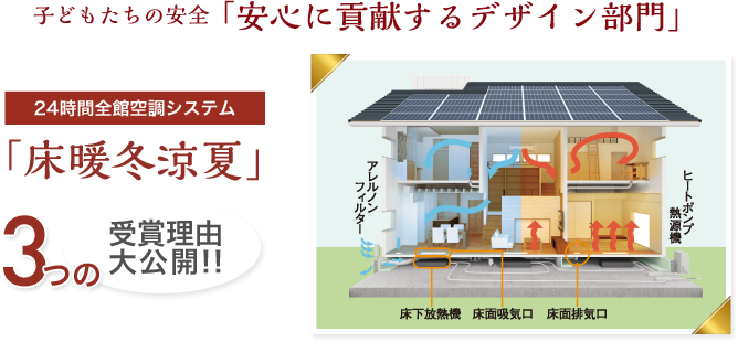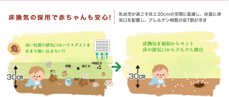 床下の熱源で温められた空気で、家全体を温めます。子どもが触れないので、ヤケドの心配がありません。