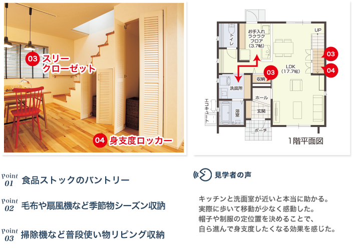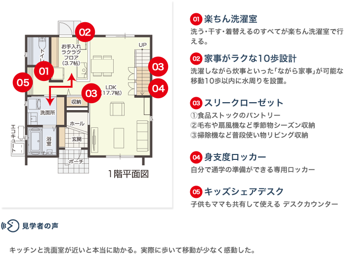 量産住宅(建売・ローコスト)は、広さ・金額が優先され、子育てがしやすい環境をつくるという視点が反映されづらいです。参考プランは、量産住宅に同等の建坪29坪サイズですが、「家事の時短」「収納」「子どもの自立」のアイデアを採用。W受賞の装備、基本設計は、イシンホーム全ての住宅に反映されています。ぜひ、お近くの展示場、見学会で、ご体感ください。