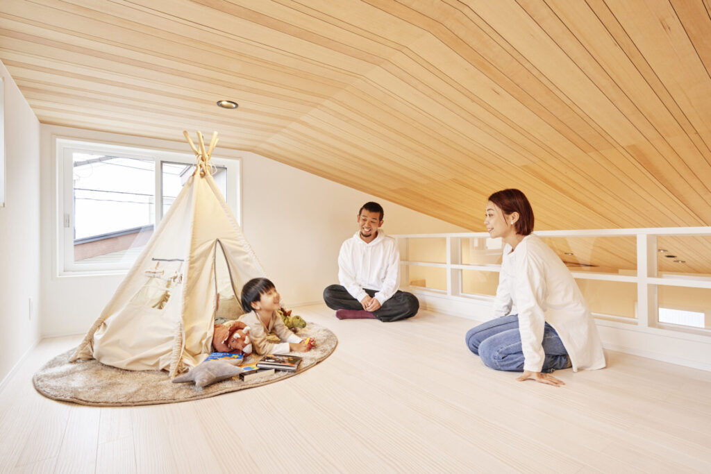 天井までの高さがあり開放的ではあるものの、天井付近の斜めになった空間がデッドスペースになりがちです。この部分にロフトを設置すれば、普段使わないものの収納スペースとしての活用はもちろん、ある程度の広さがあれば、ちょっとした子どもの遊び場にもなります。