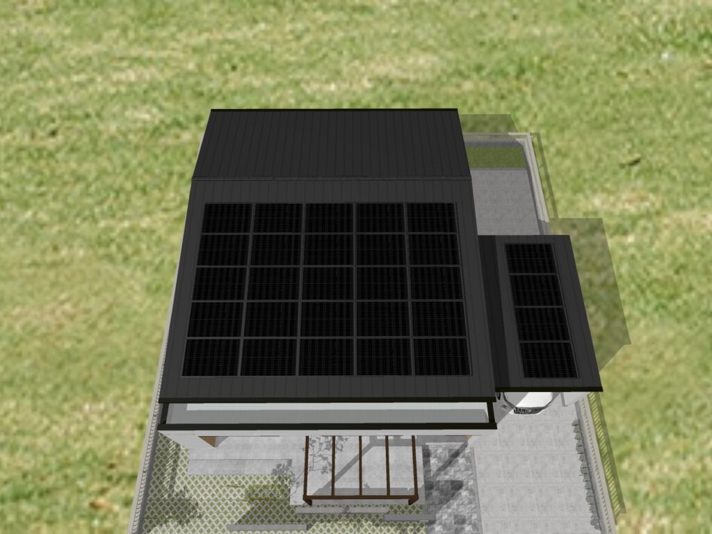 老後まで喜ばれる贅沢な設計の平屋。屋根の大きさを生かし、居住スペースに大型ソーラーを搭載。インナーガレージには標準仕様で200VのEV車充電アダプターが付いています。