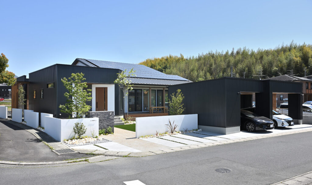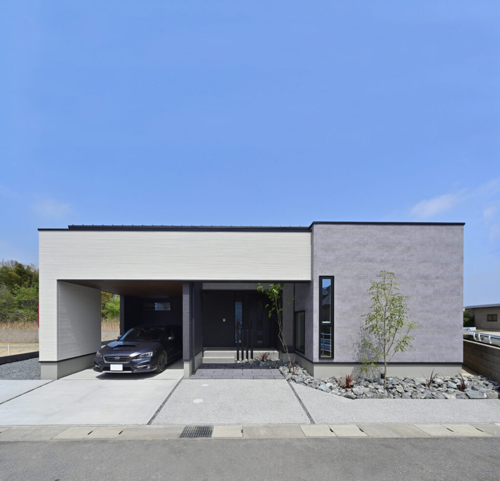 若い世代に大人気のモダンなモノトーンデザイン。平屋のガレージハウスなら、駐車スペースもスタイリッシュにまとまります。ガレージから室内までは、屋根付きのポーチを通って移動できるので、雨の日も安心です。