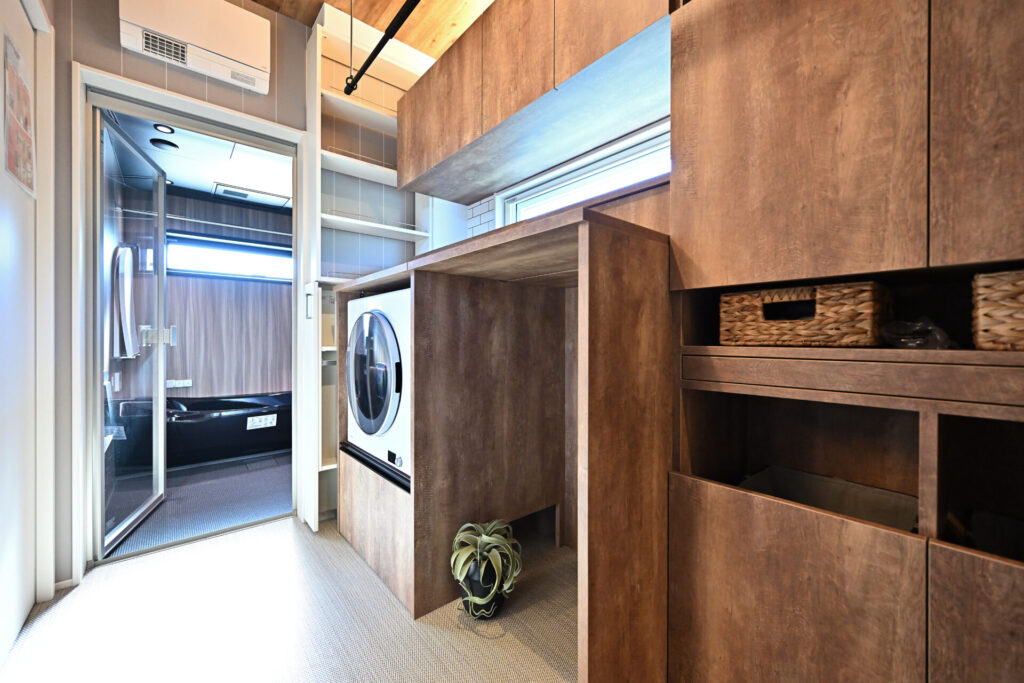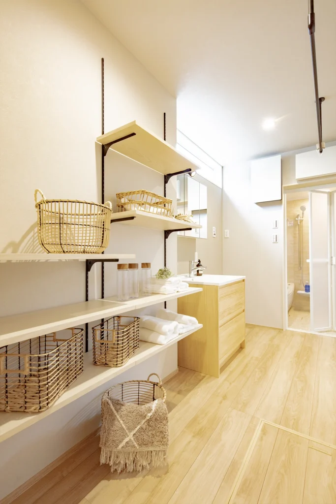 さらに有効なのが、通路そのものを機能化することです。玄関から洗面へ向かう動線上に、室内干しスペースや壁面収納を組み込むと、移動経路がそのまま「洗う・干す・しまう」の場所になります。通るだけの空間ではなく、家事が完結する空間に変えられます。