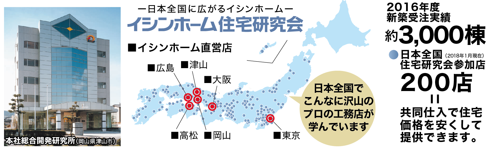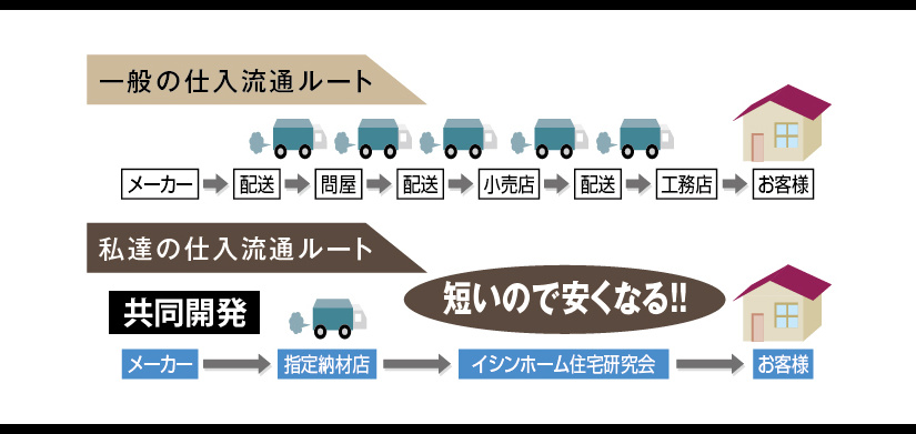 イシンホーム住宅研究会本部は商品開発チームを結成し独自で開発した販売・設計・施工のノウハウを会員店に提供するとともに、優れた資材を一括購入することで購入にかかるコストを飛躍的に落とし、高品質・高性能な家をお客様に提供できる仕組みになっています。