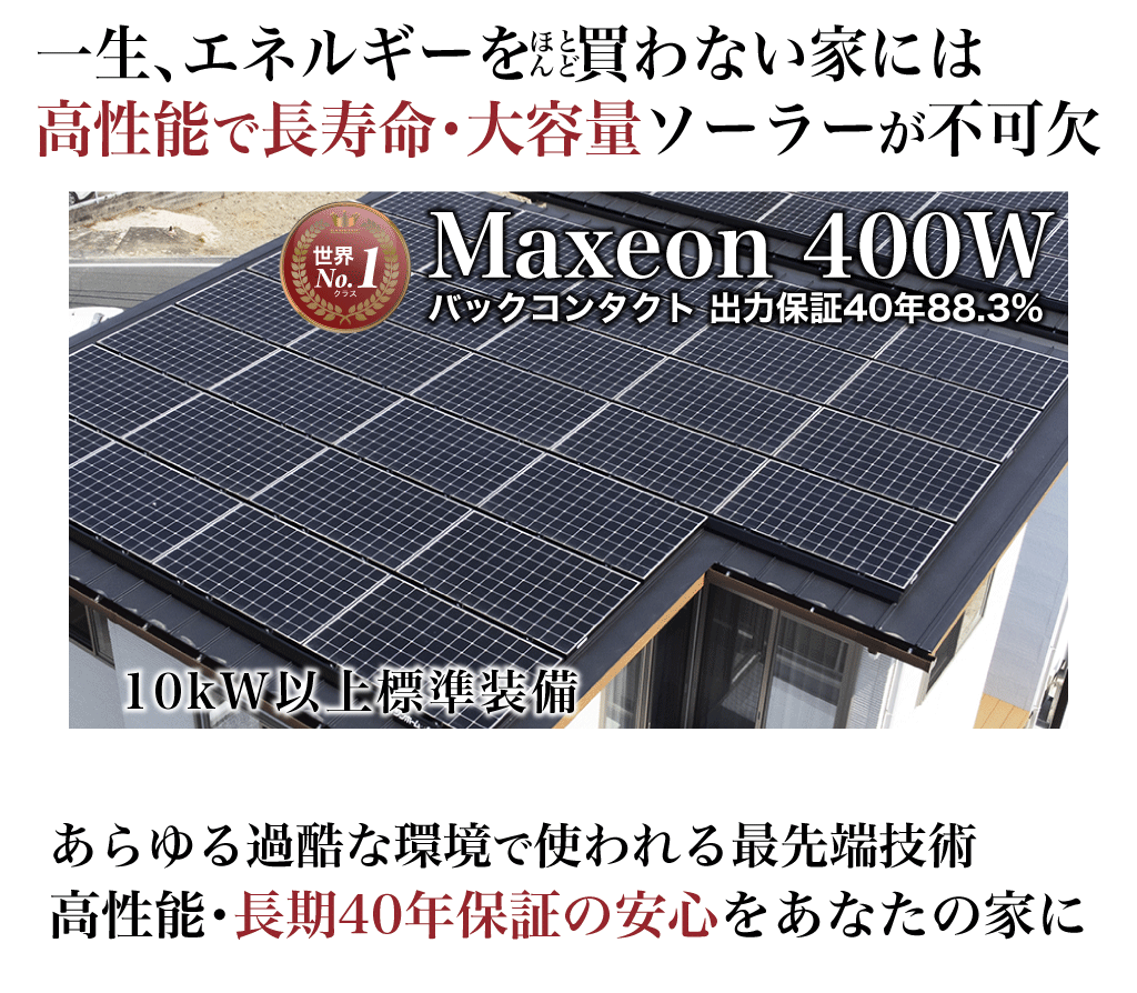 ハイエンドモデルのmaxeonは、製品保証・出力保証共に40年の業界最長保証。住宅ローン完済、老後まで大きな利益をもたらしてくれます。