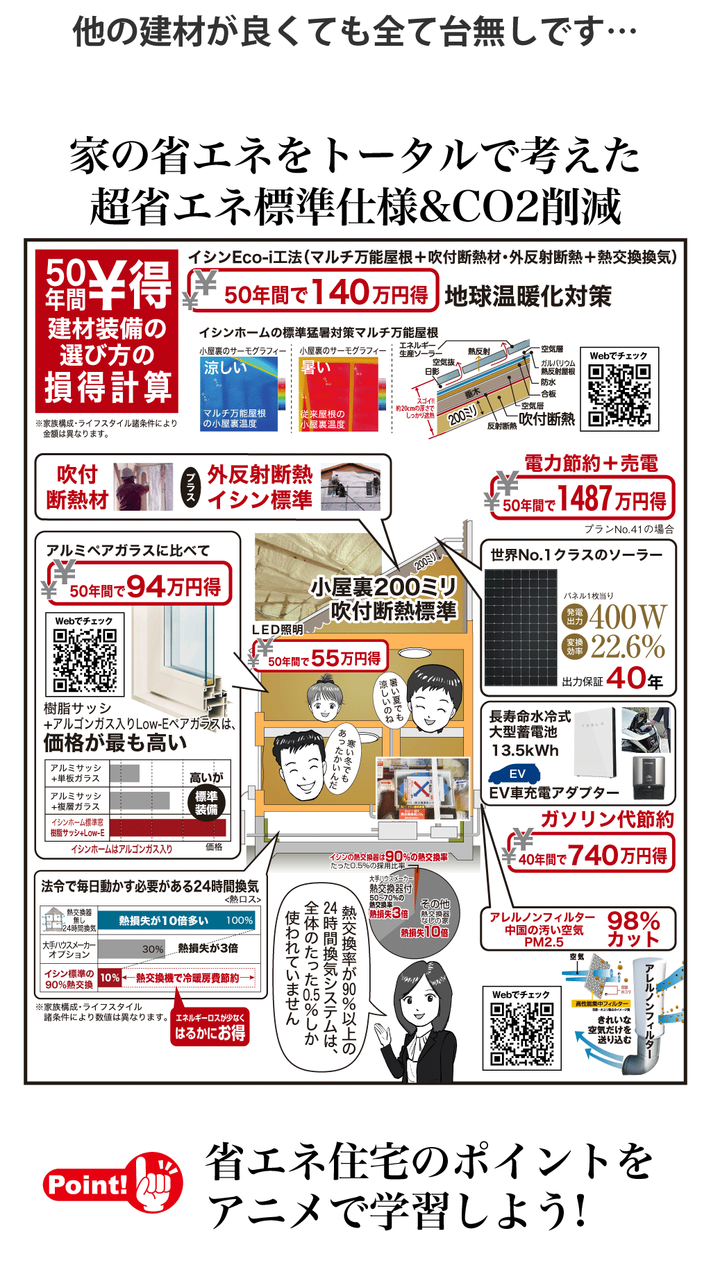 200VのEV車充電アダプターも標準装備で光熱費やガソリン代を大きく節約。50年間で1,000〜2,000万円にもなります。※1