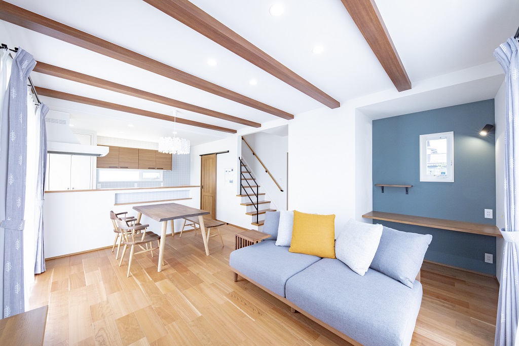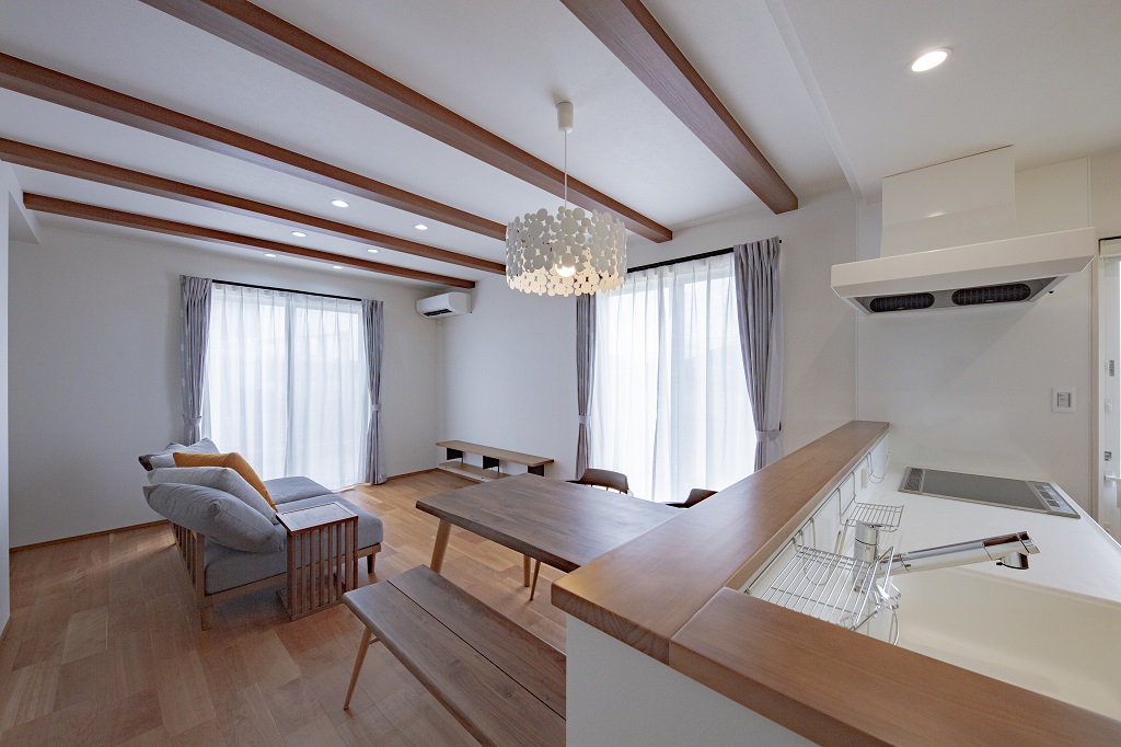 天井を通常より20cm高く取り、梁を見せるデザイン性の高いLDK。