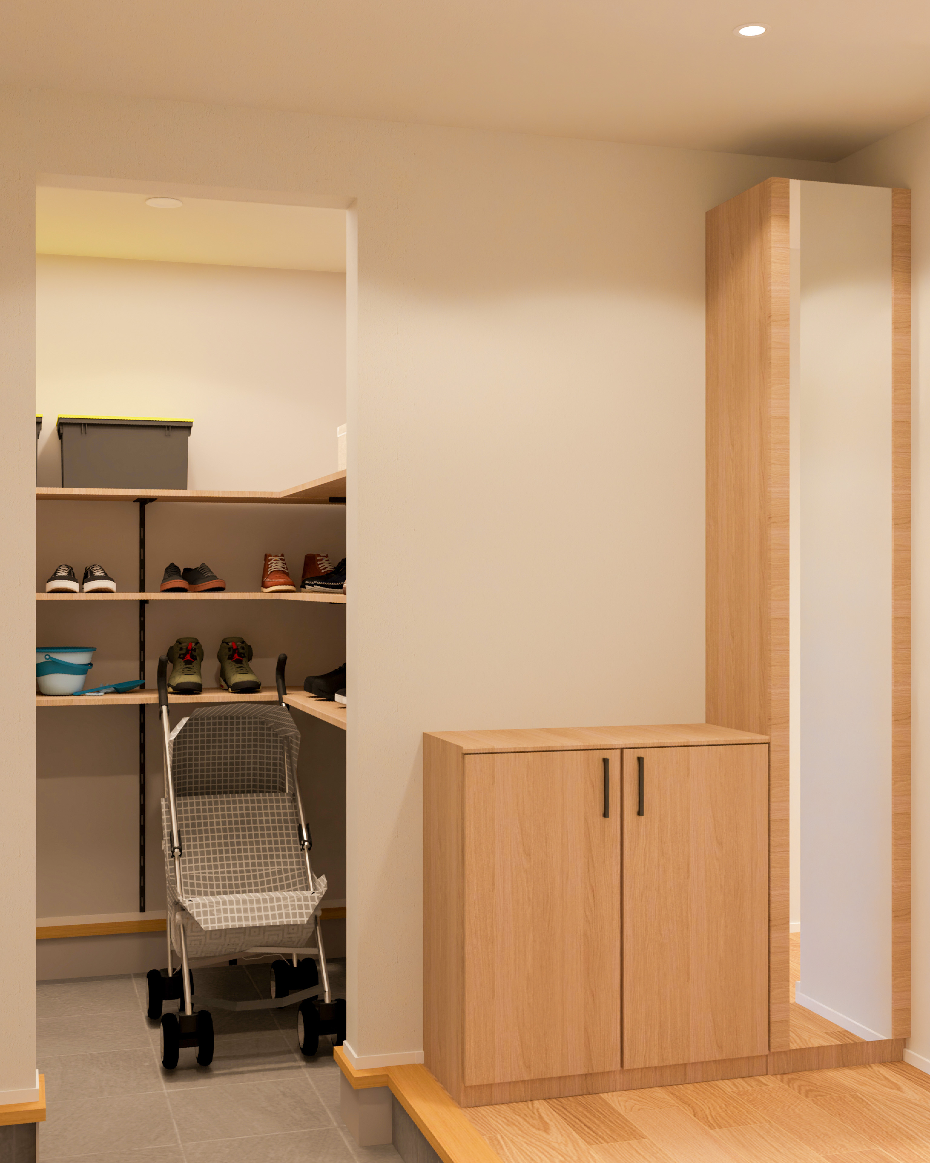 玄関に設けたシューズクロークは、靴はもちろん、大きな荷物もまとめて収納可能。
