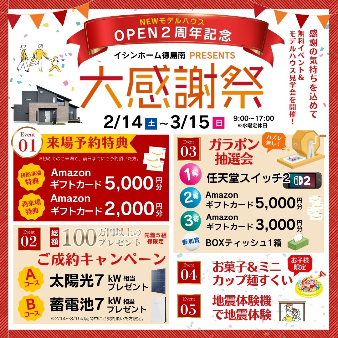 2/14~3/15 OPEN2周年記念 大感謝祭開催!!