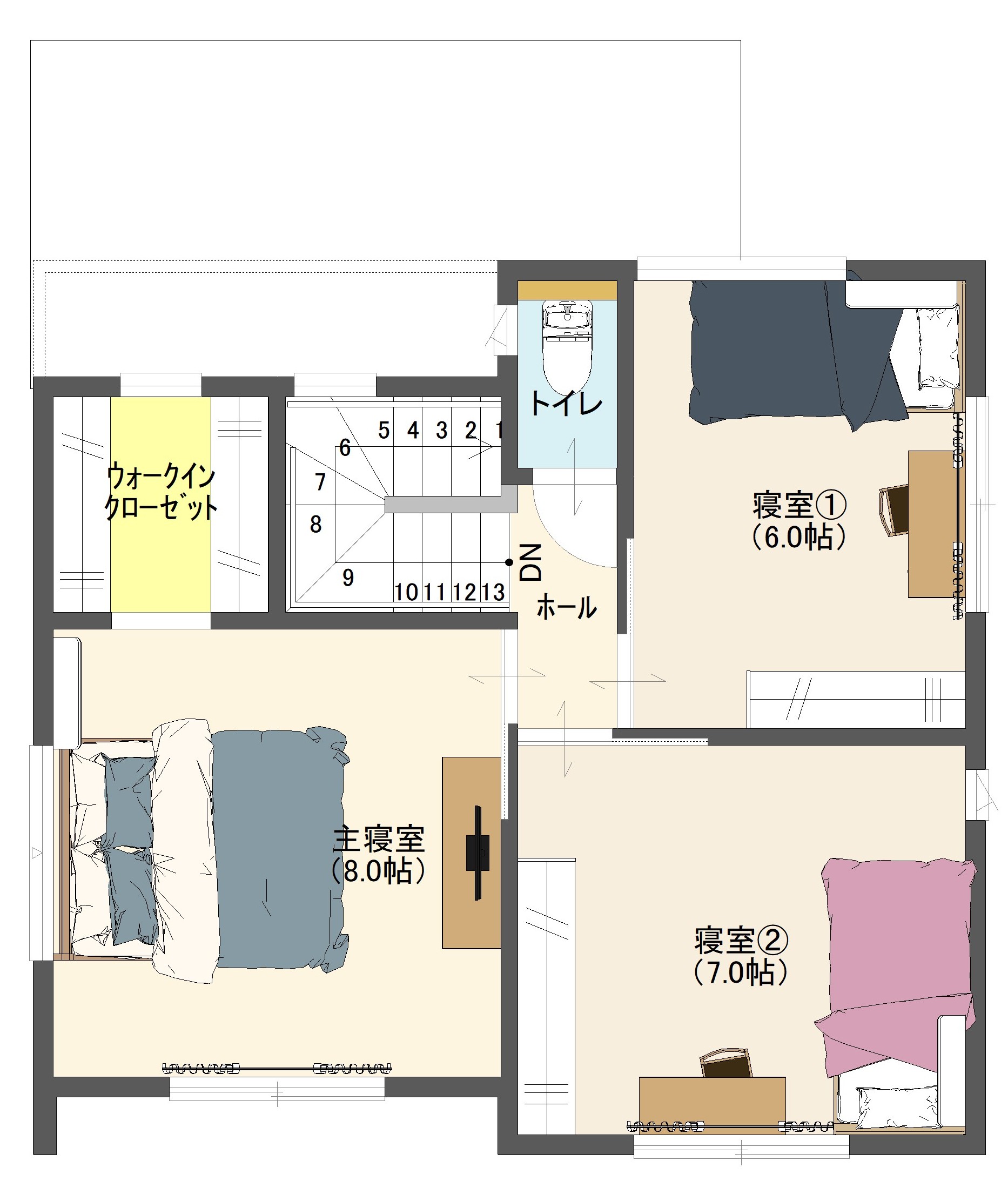 🛏️ 2階の寝室プラン 主寝室8帖+WIC、