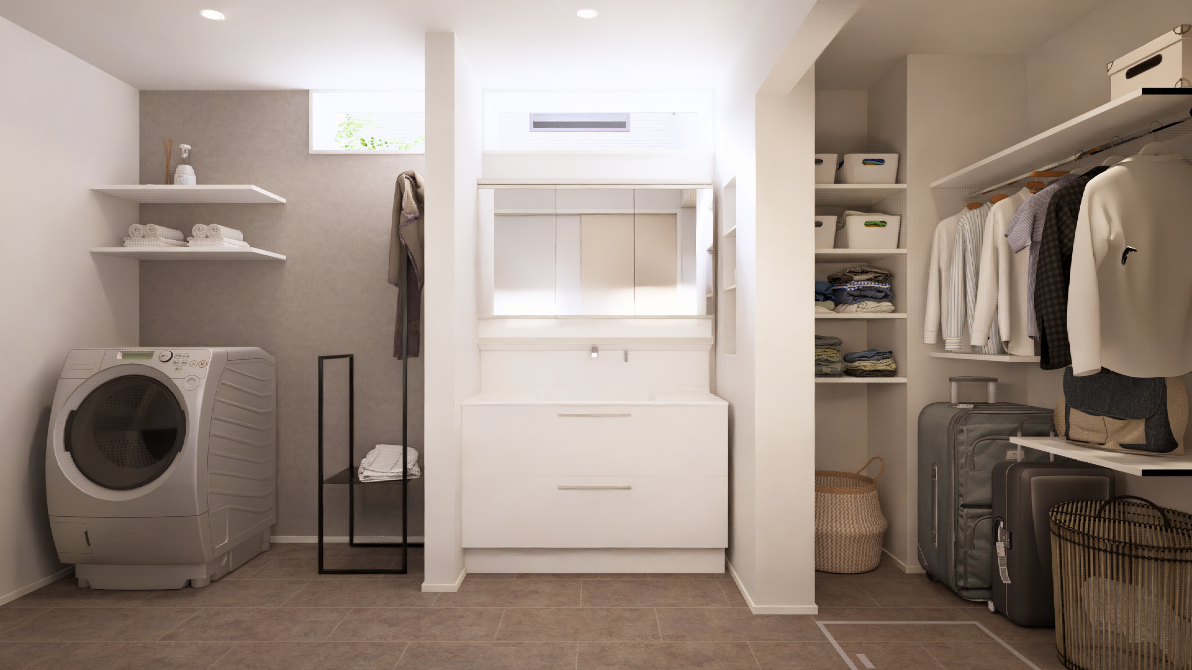 洗う・干す・しまうがスムーズにつながるランドリー洗面室とファミリークローゼット、