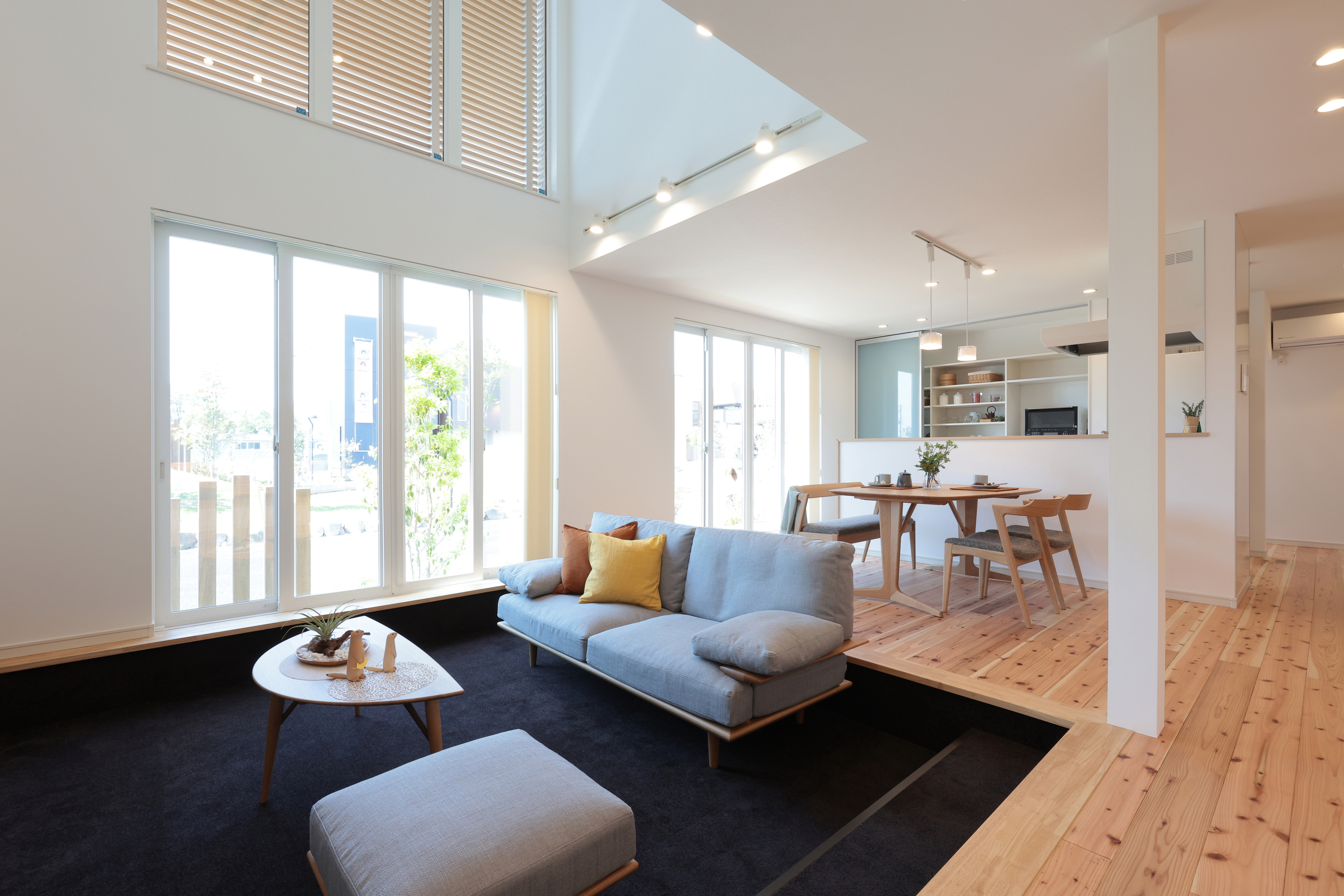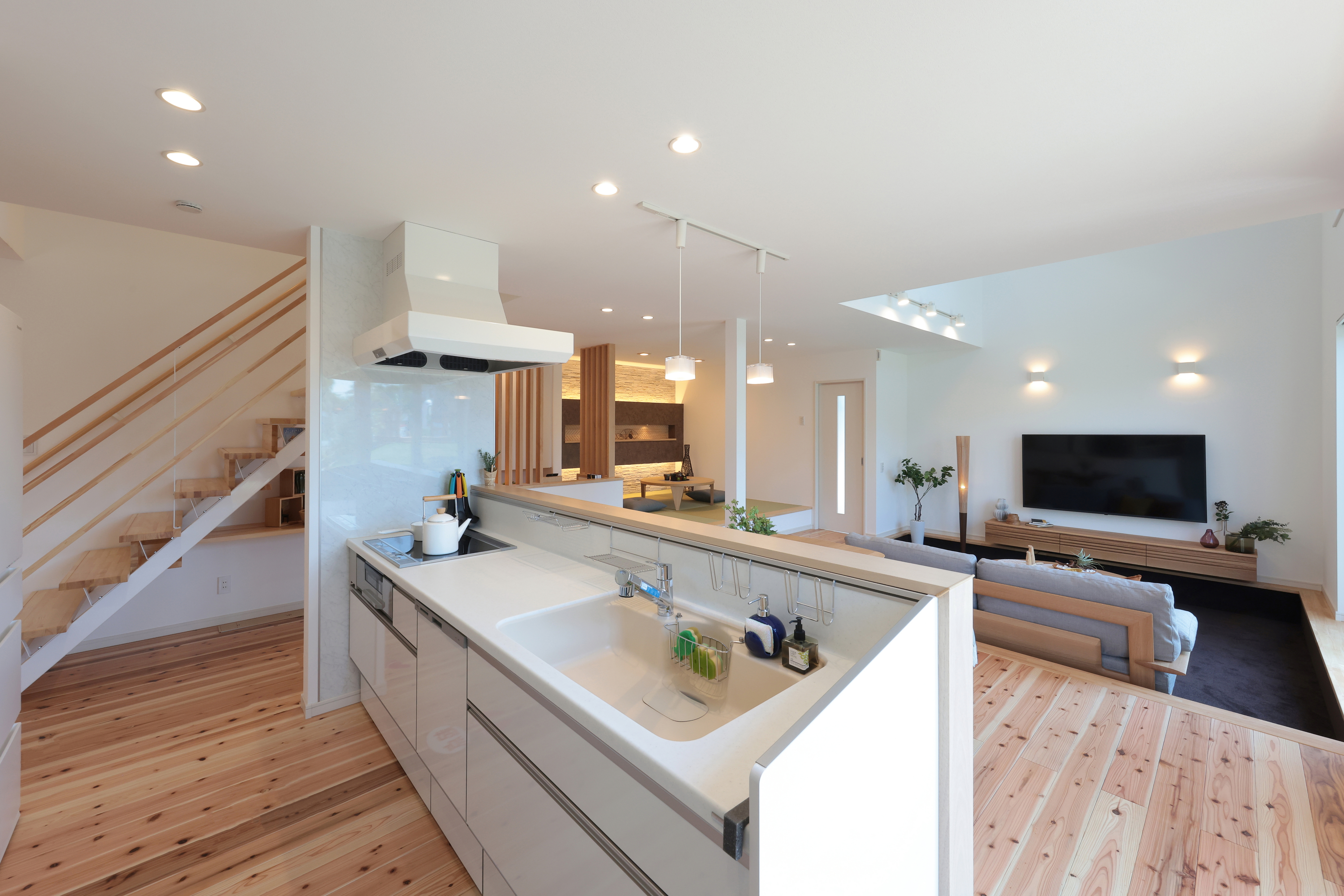 キッチンを起点に、家族がどこにいても共有できる空間でダイニングはもちろん、段下がりリビング、畳スペースまで見渡せます。照明からは音楽が流れたり、最新のスマートハウスアイテムも満載です。