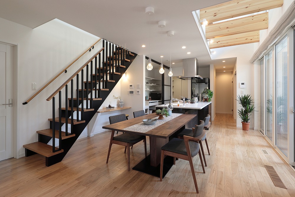 キッチンが家の中心にあり、家族がどこにいても共有できる空間でダイニングはもちろん、段下がりリビング、畳スペース、中庭まで見渡せます。照明からは音楽が流れたり、最新のスマートハウスアイテムも満載です。