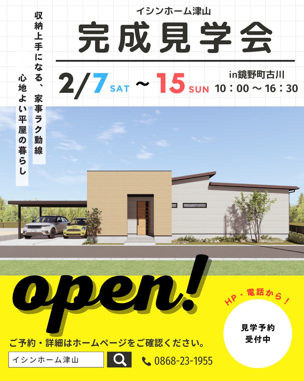 【鏡野町古川】家族にやさしい暮らしを体感する、平屋の完成見学会