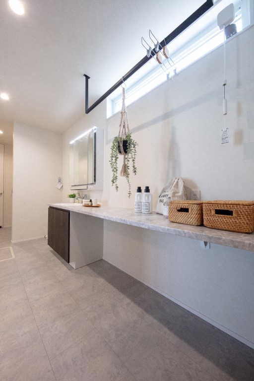 イシンおなじみの洗う→干す→しまうが1ヵ所で完結するウォークスルー洗面。