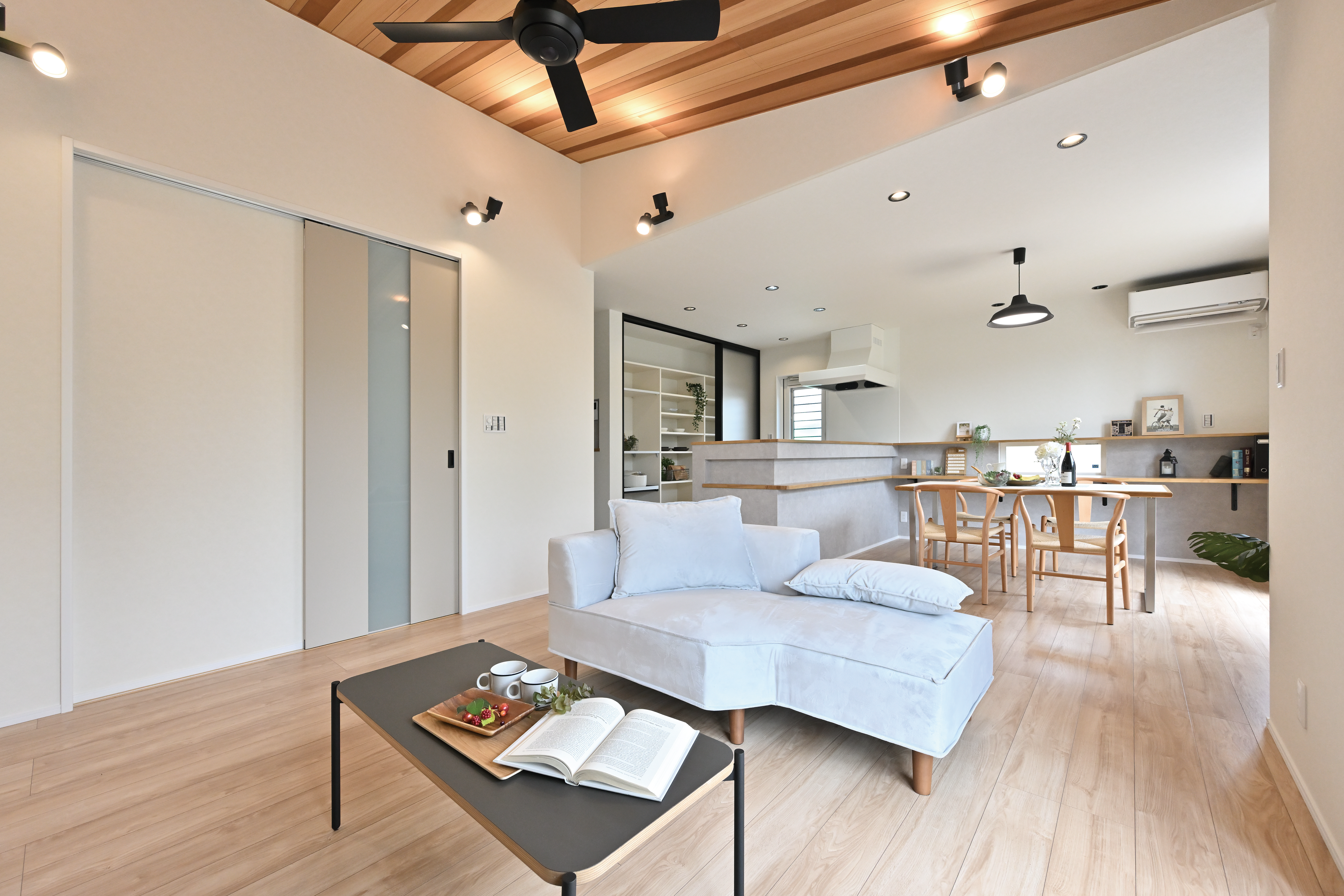 平屋ならではの勾配天井でより広くゆったりとくつろげます。
