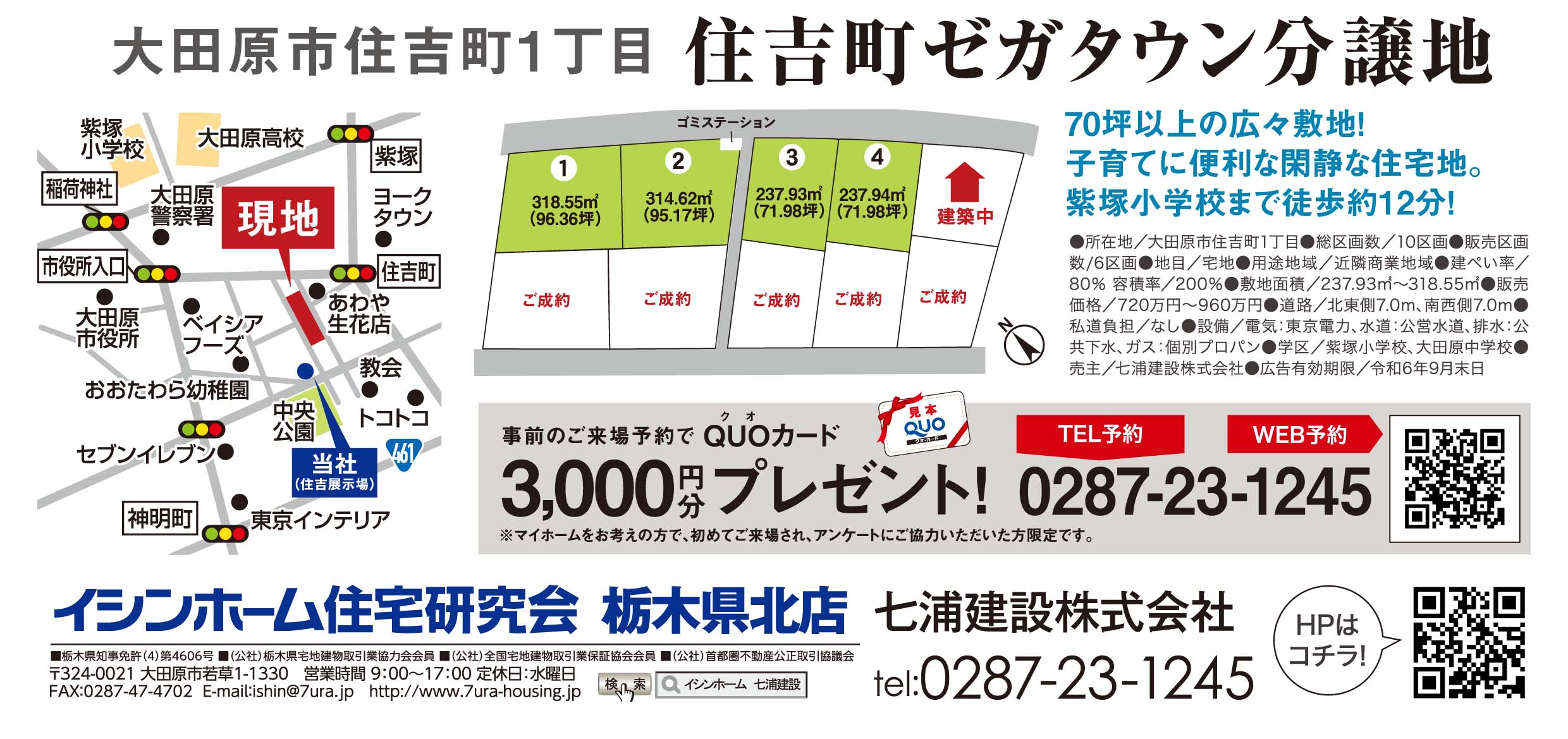 ●所在地/大田原市住吉町1丁目●総区画数/10区画●販売区画数/4区画●地目/宅地●用途地域/近隣商業地域●建蔽率/80%●容積率/200%●敷地面積237.94㎡~318.55㎡●販売価格720万円~1,045万円●道路/北東側7.0m●私道負担/なし●設備/電気:東京電力、水道:公営水道、排水:公共下水、ガス:個別プロパン●学区/紫塚小学校、大田原中学校●売主/七浦建設株式会社●広告有効期限/令和6年9月30日