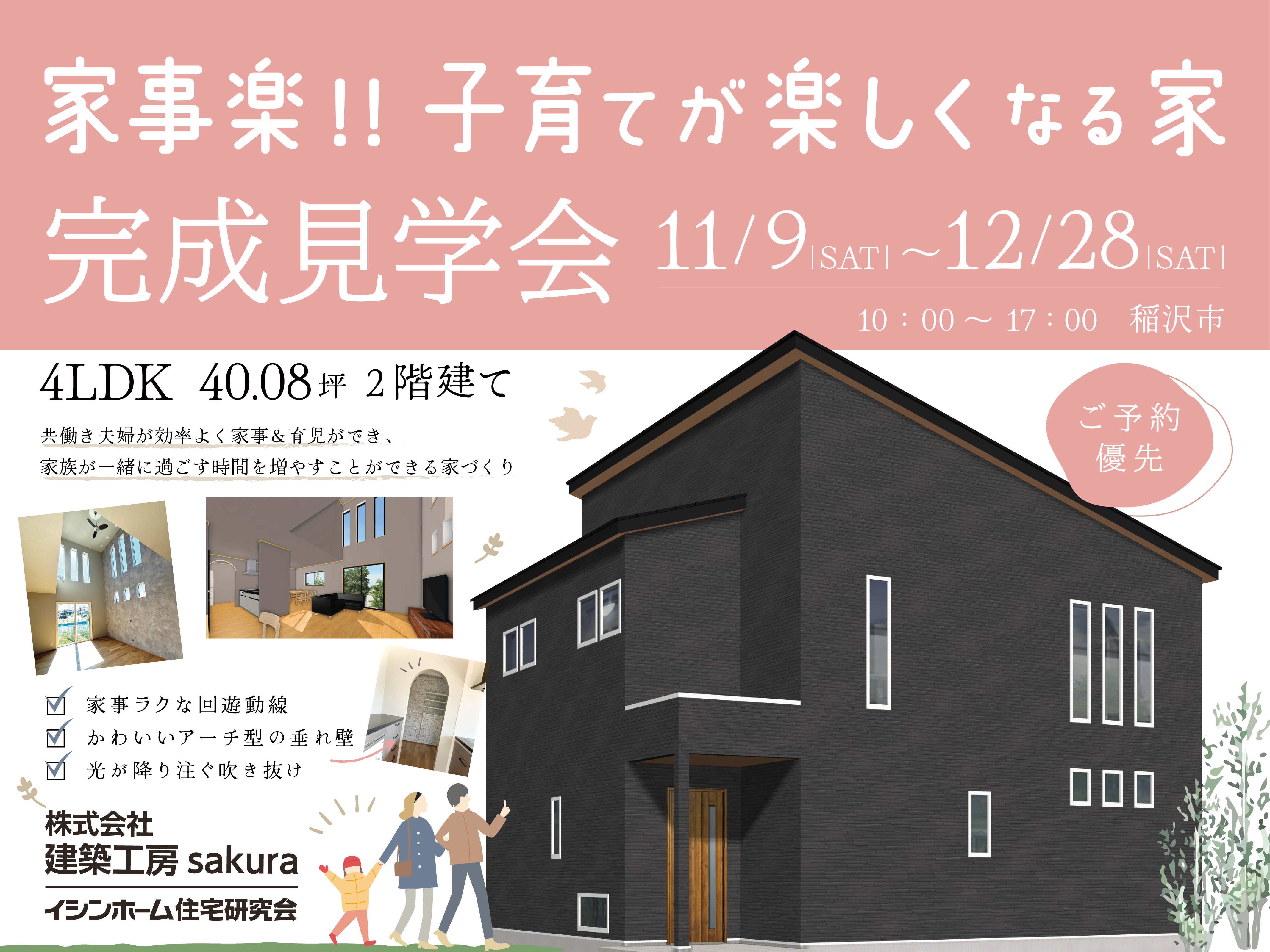 この見学会では、40.08坪の広々とした4LDKの2階建て住宅をご覧いただけます。家事の負担を軽減するために設計されたこの家は、家族の生活スタイルに合わせた工夫が満載です。