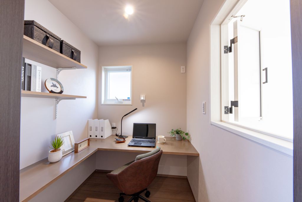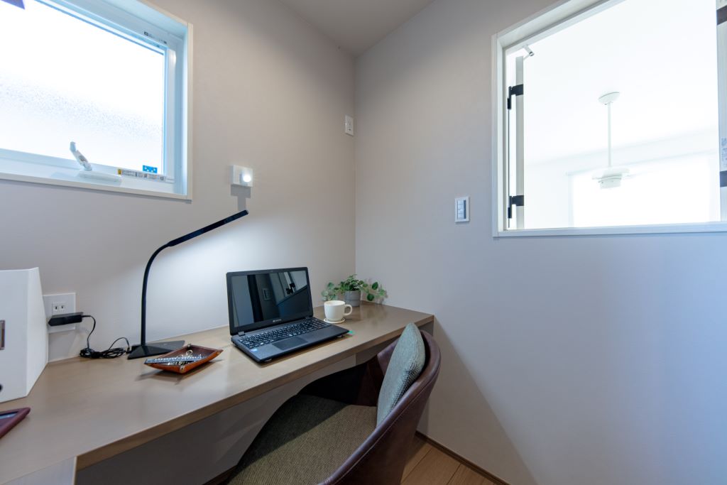 できれば作ってほしいと世のパパ全員が賛同するであろう書斎をこんなにも贅沢に配置いたしました。パパの特等席は抜き抜けの横