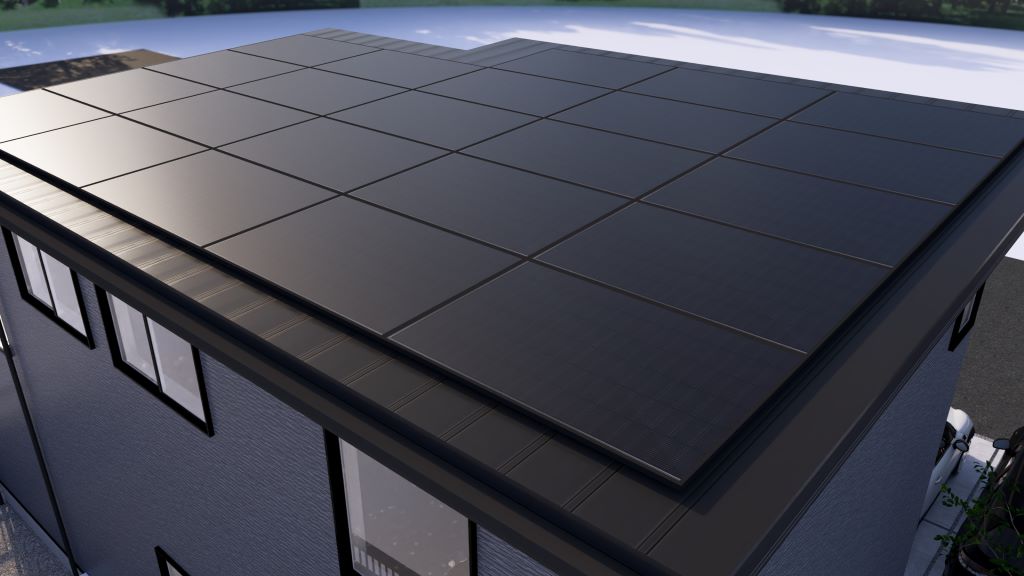 屋根に設置された太陽光パネルは大容量の9.89kW☼