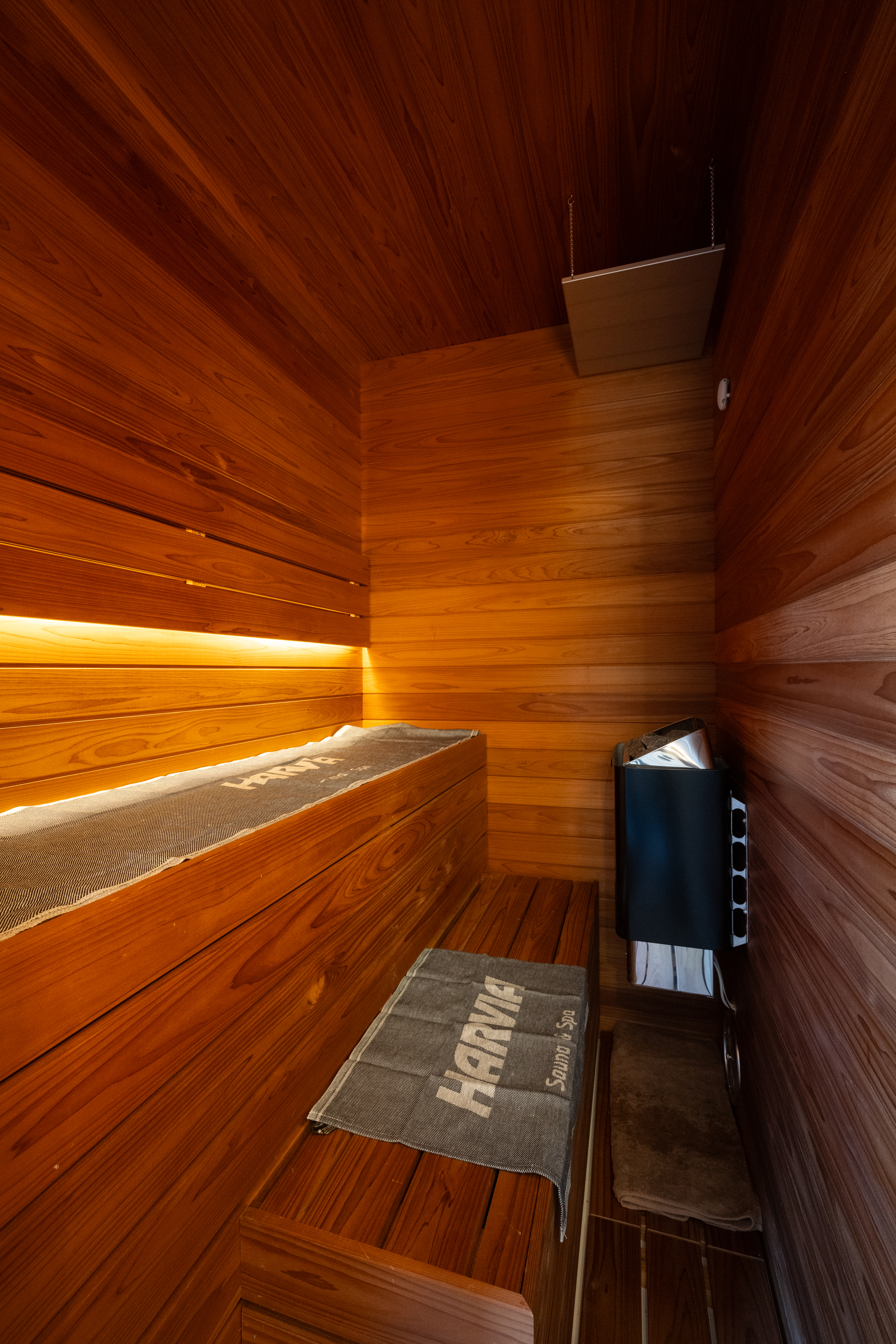 室内に設置されたサウナ室は、フィンランド発祥の世界NO.1のサウナヒーターブランド「HARVIA」のサウナヒーターを設置しており、ご見学時にはサウナ&ロウリュ体験も可能!