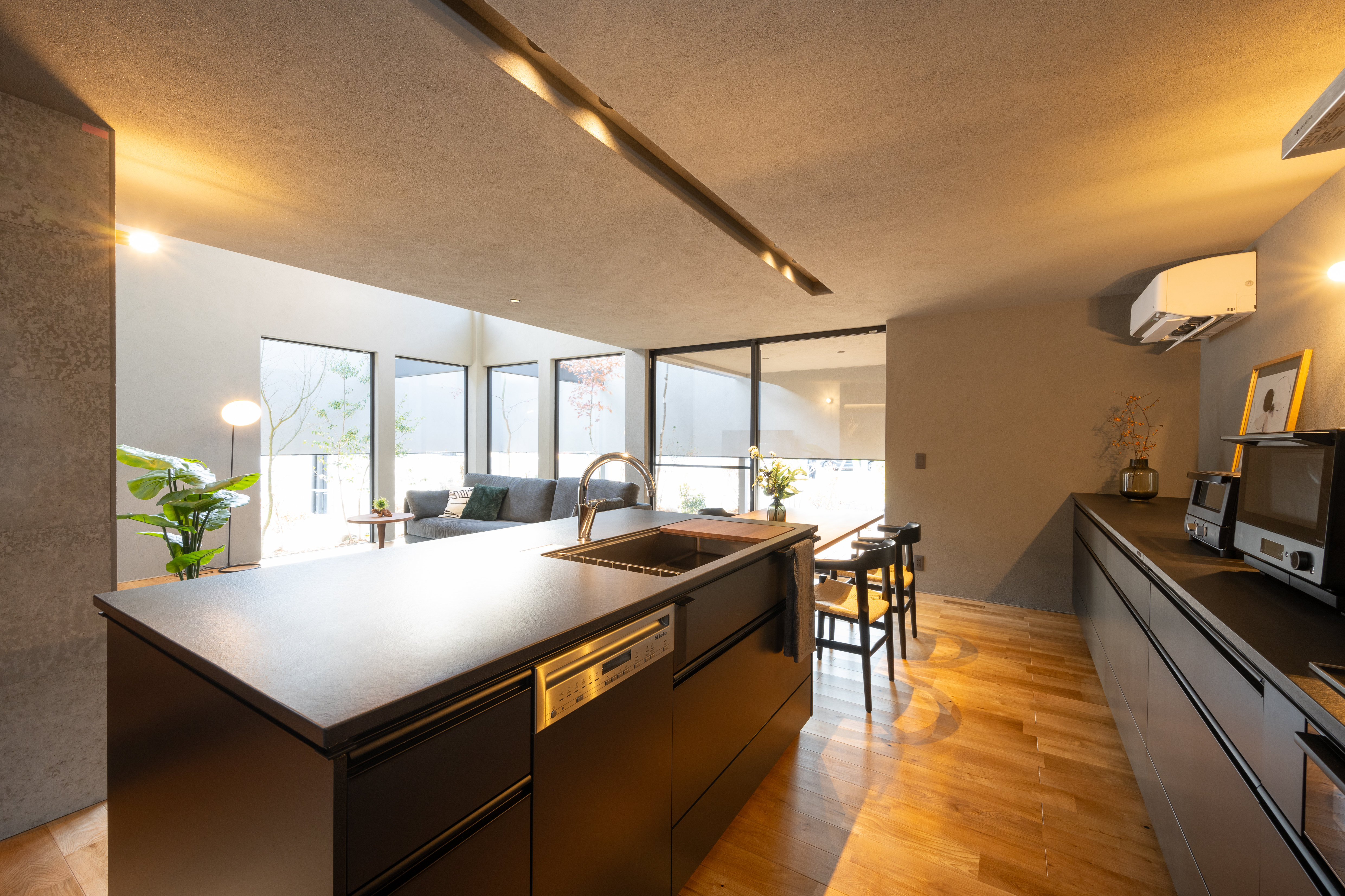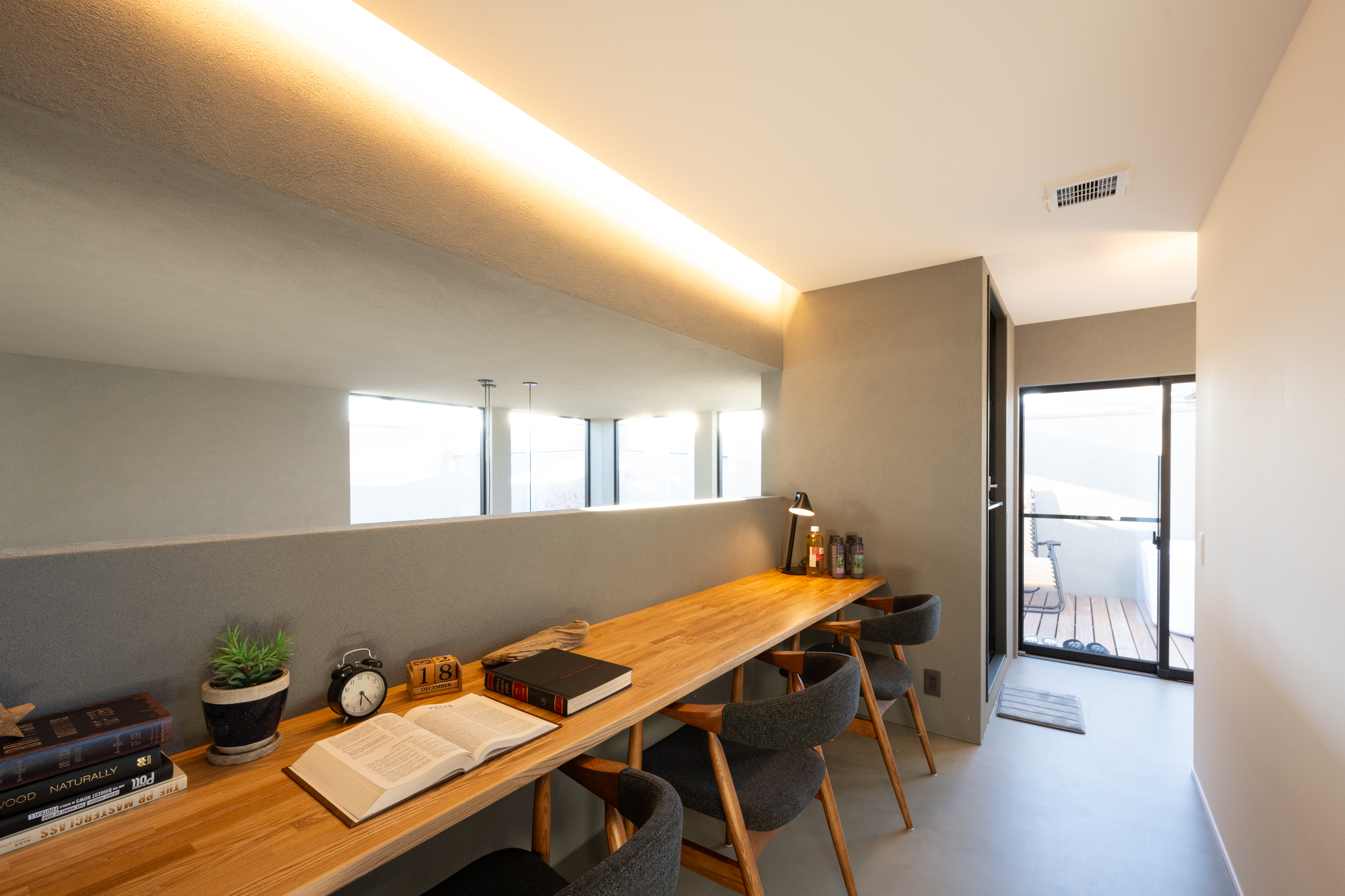 サウナ付きという特徴だけでなく、塗り壁で仕上げられた内外装や、壁と一体に見えるフルハイドア、洗練された住宅設備、家族の生活を考えた間取りと動線など、見所満載のモデルハウスです。