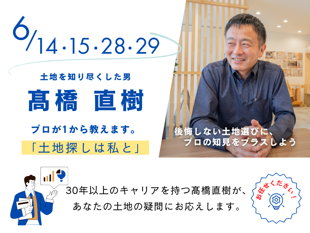 この相談会では、土地探しのプロである髙橋直樹が、あなたの理想にぴったりの土地を見つけるお手伝いをいたします。