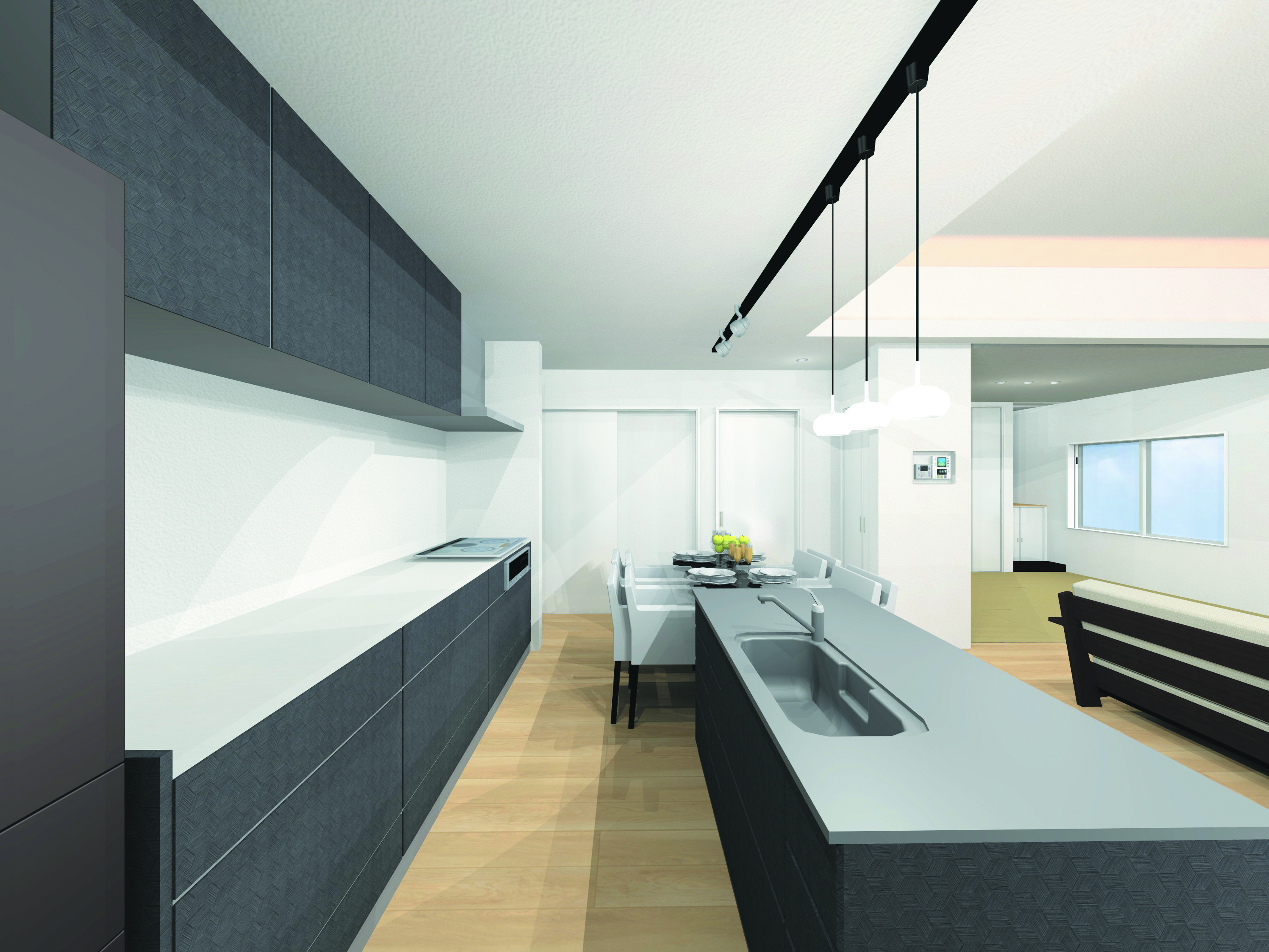 ゆったりとした3mの高天井に、柔らかな間接照明が灯る心地よい空間。昼間は窓からの陽光が優しく広がり、夜には間接照明の光の演出が空間に深みを与えます。