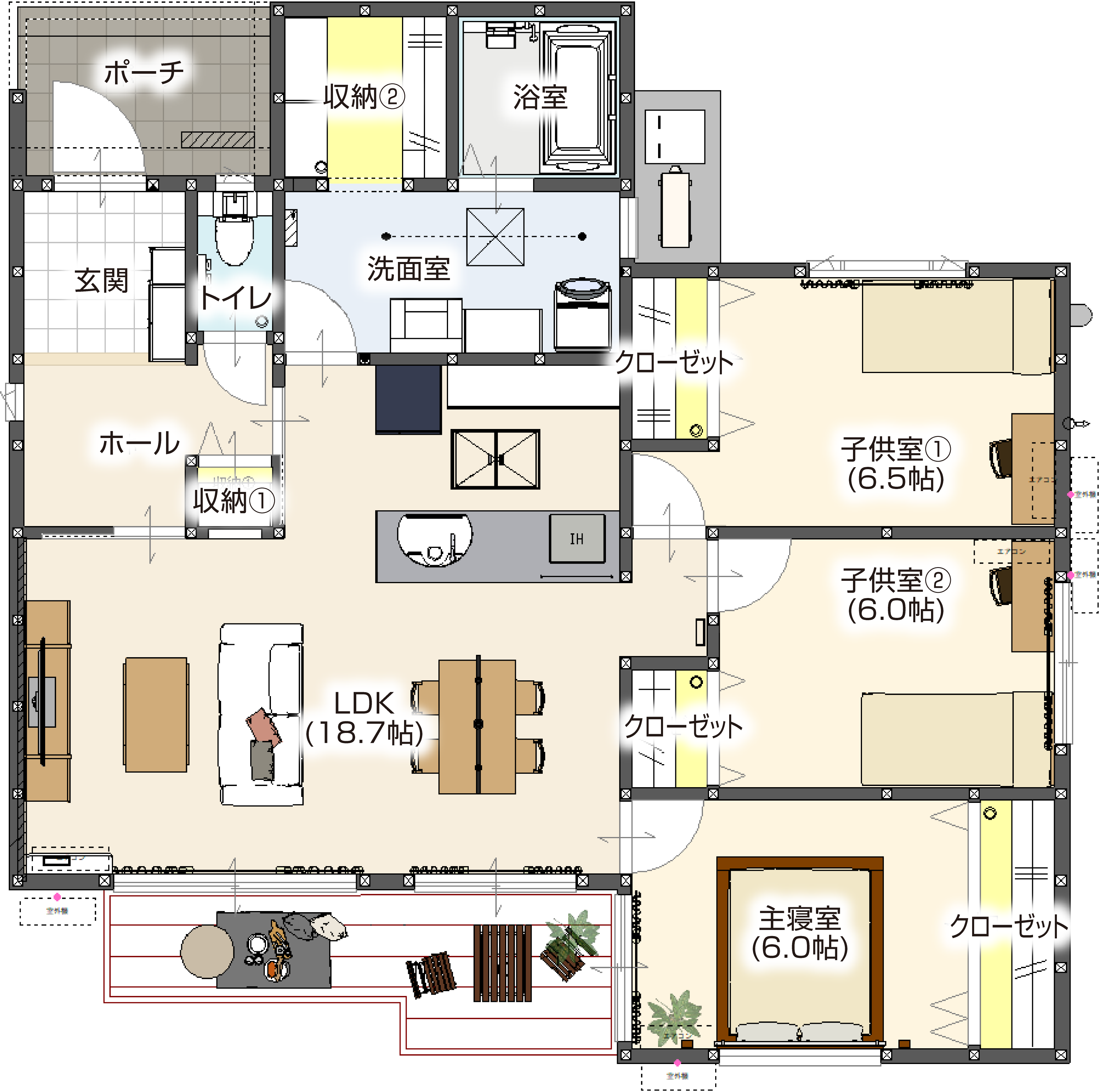 18.7帖のLDKから家のどこへでも行ける間取り。