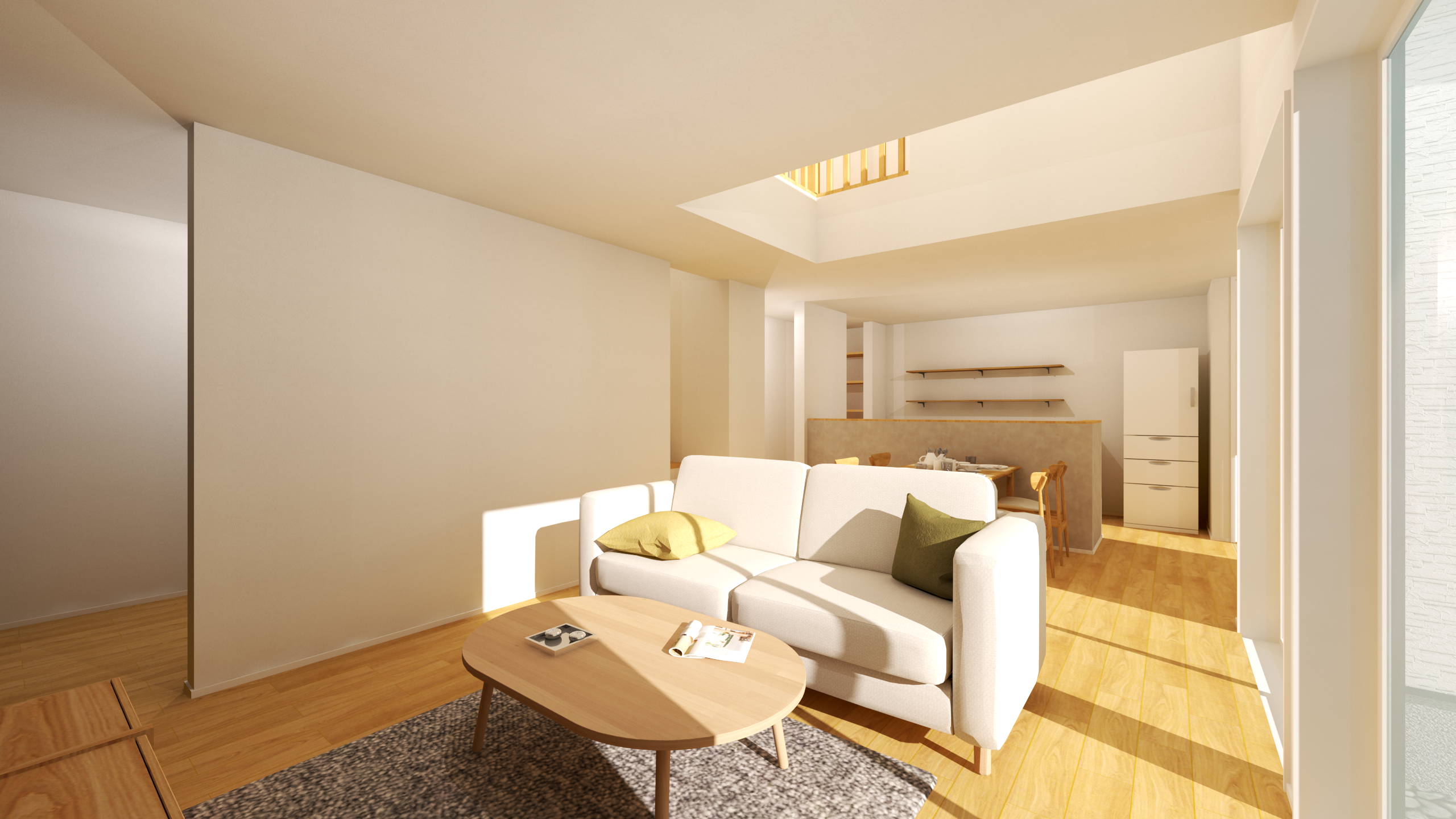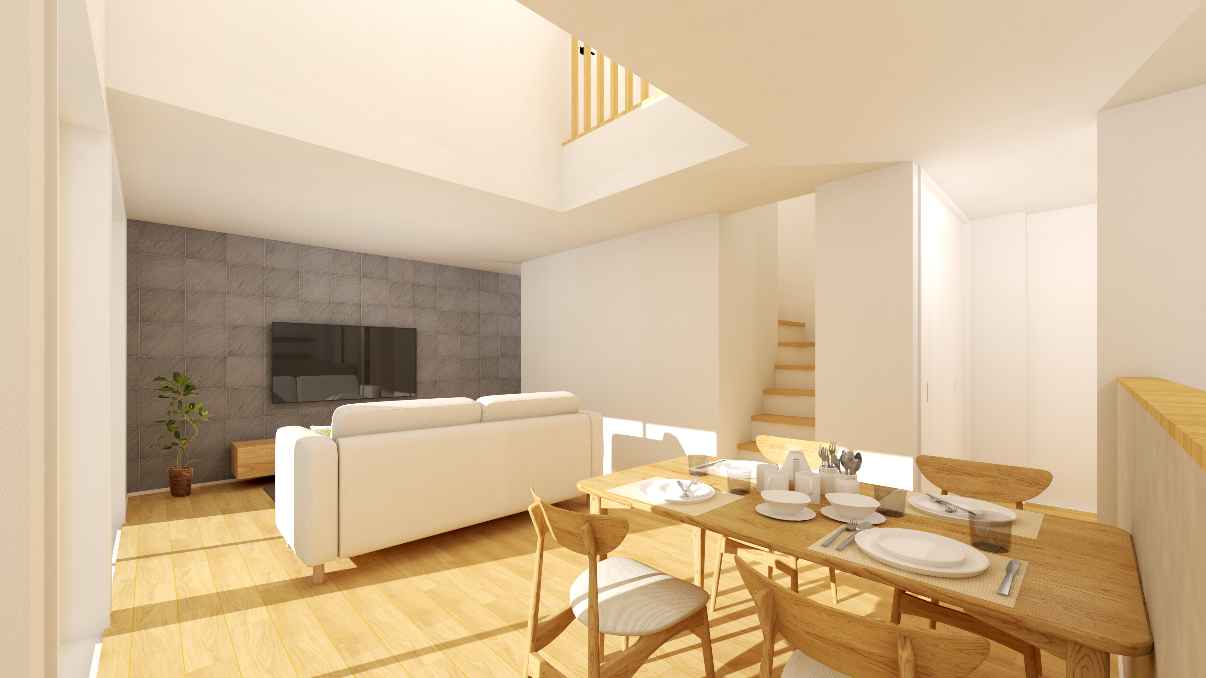 大きな吹抜から光が降り注ぐ、明るく開放的なリビングが家族の時間をより豊かに彩ります。