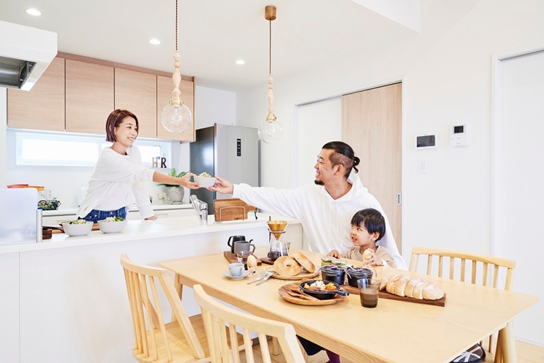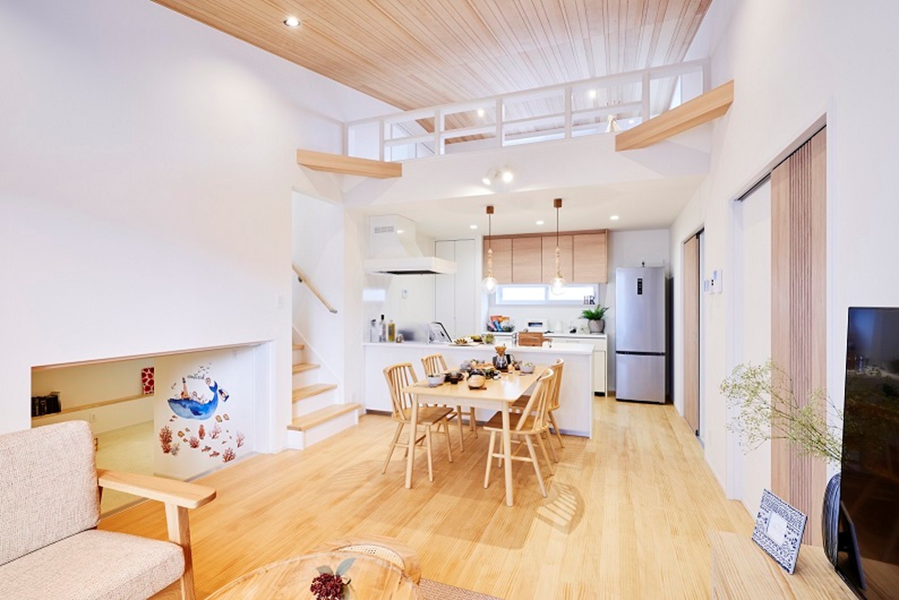 あたたかみのあるデザインと屋根を高くすることにより、開放的なLDKを実現しました。