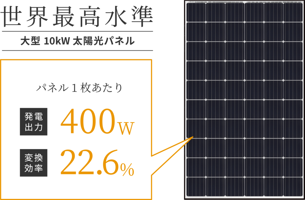 世界最高水準400Wのバックコンタクトパネルです。非常に長寿命でありその製品保証は40年、ローンを払い終えるまで続きます。エネルギー高騰の歯止めがかからない今必要な設備です。
