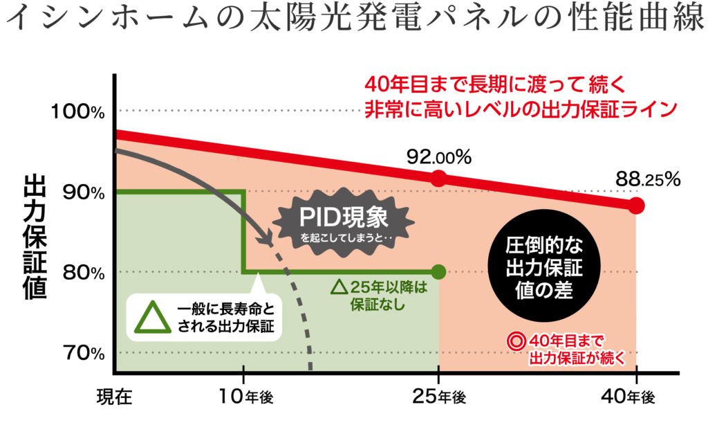 技術のイシンホームをあらわす、大型太陽光パネルや大容量蓄電池などの装備とその保証期間にご注目ください。