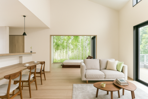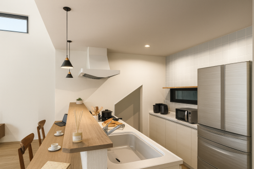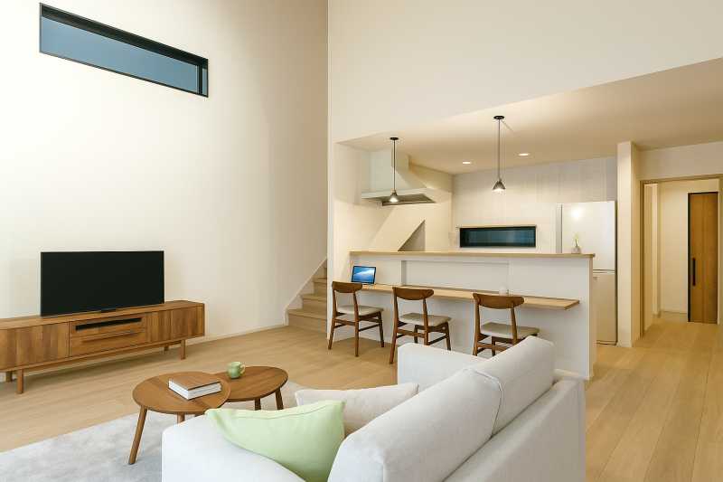 作り付けダイニングカウンターや3メートルを超える大開口の吹き抜けで