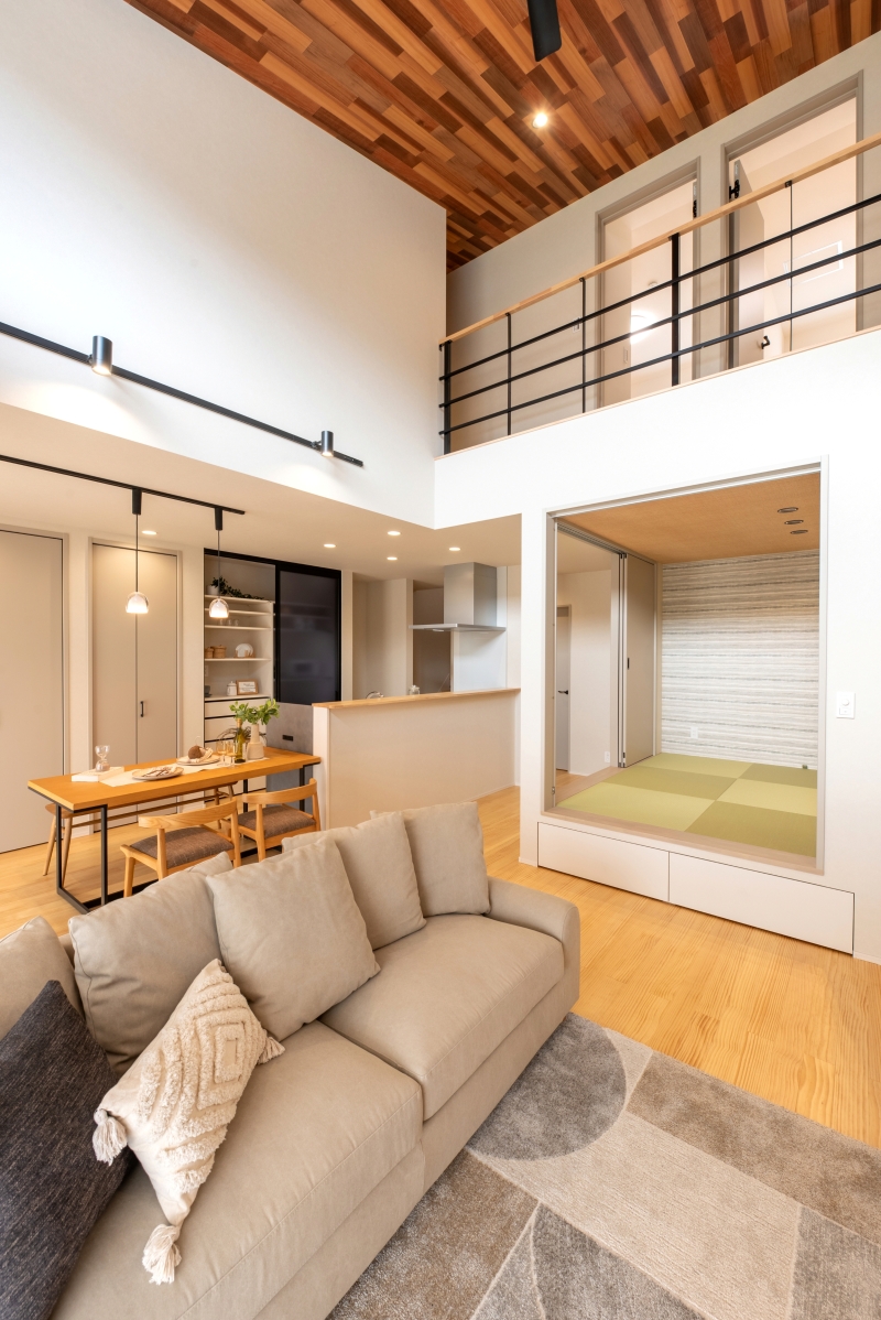 大空間の吹き抜けに柔らかな陽が差すリビング