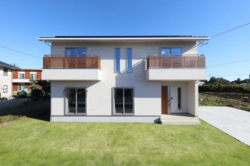 「白い外壁と木目手すりが魅力の家 ~2か所のバルコニーと吹き抜けが広がる和の空間~」