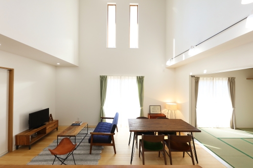 白い外壁に木目デザインの手すりがアクセントを加えた、スタイリッシュな家。2か所のバルコニーが開放感をもたらし、外と内を繋ぐ心地よい空間を提供します。吹き抜けのあるリビングが広がりを感じさせ、光と風が行き渡る設計です。和室が家全体に安らぎを与え、モダンと和が美しく調和した住まいです。