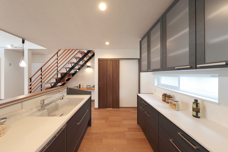 グレーの外観にネイビーで玄関を貼り分けた、シンプルでありながら個性が光る平屋。勾配天井と天井の木目クロスが温かみを加え、開放感あふれる空間を演出します。リビングには雲梯が設置され、家族で楽しむことができる遊び心あふれるデザインが特徴。デザイン階段がアクセントとなり、小屋裏収納が収納スペースを確保。階段下にはカウンターが設けられ、実用的かつスタイリッシュなインテリアが広がる、和室のある落ち着いた住まいです。