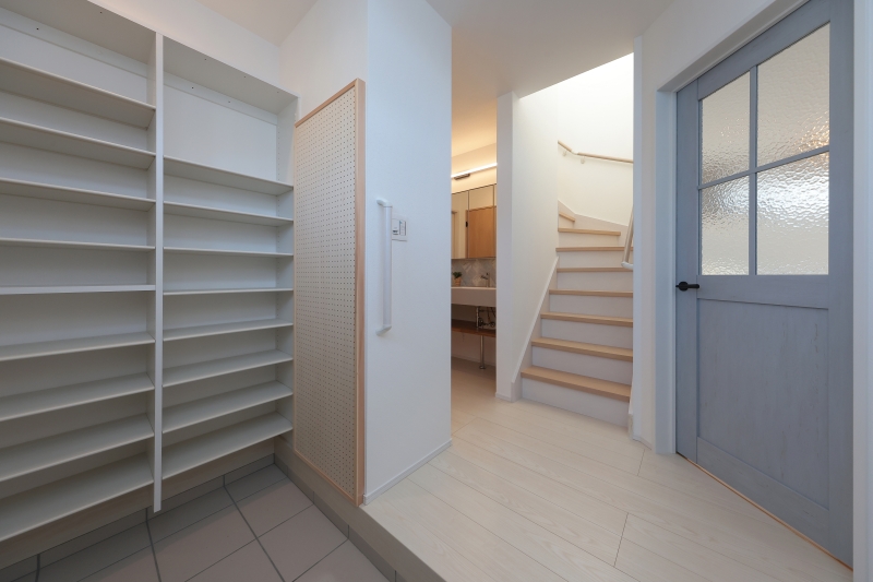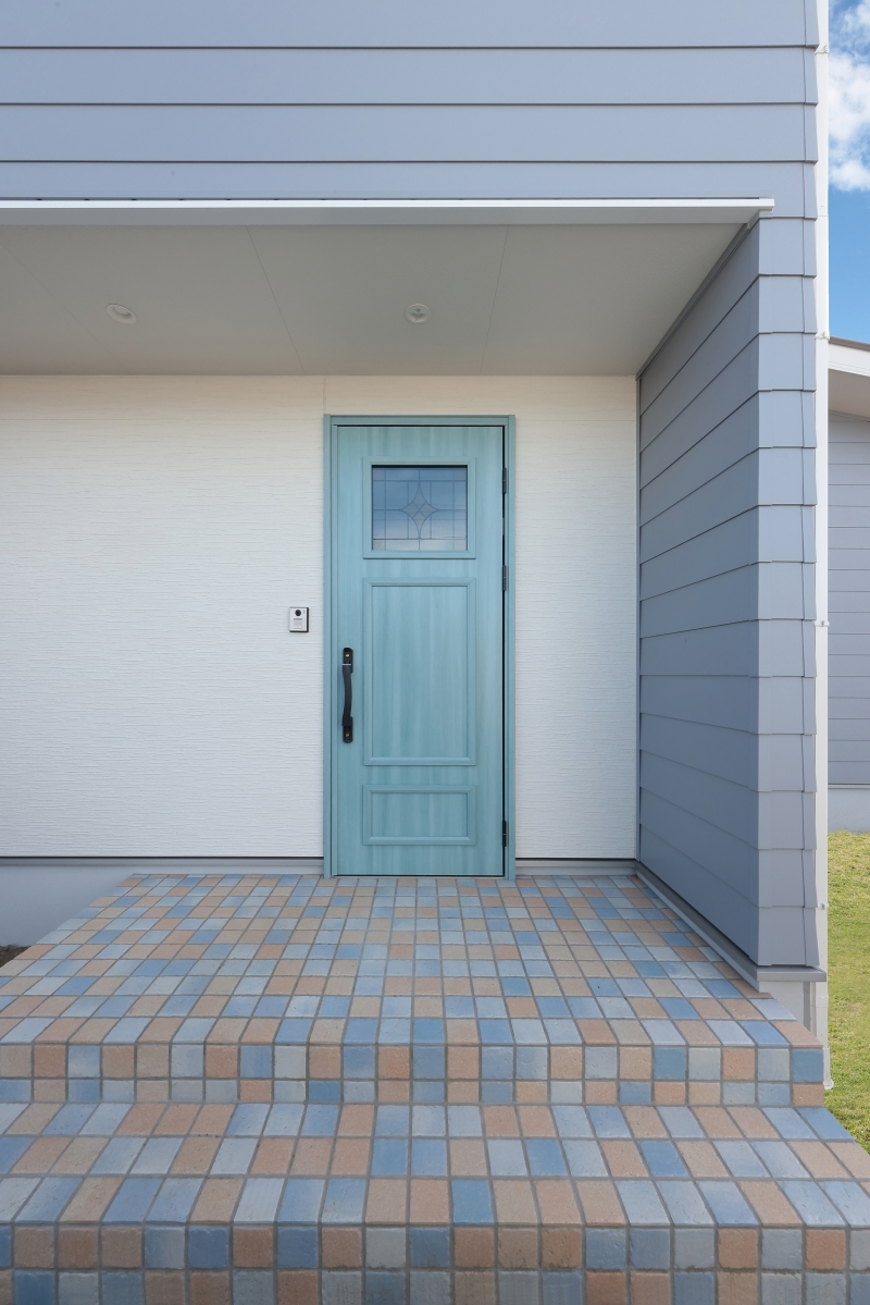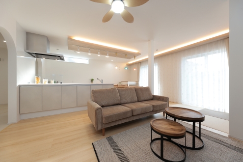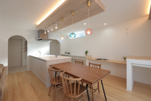 太陽光パネルを搭載し、環境にも家計にもやさしい暮らしを実現。ぐるりと回れる回遊動線で、毎日の家事がぐんとラクに。キッチンには木目の下がり天井と間接照明をあしらい、ナチュラルで落ち着いた雰囲気に。Rの下がり壁が空間にやわらかさを添えます。ダイニングには可愛いペンダントライト、リビングの一角には畳スペースを設け、家族が自由にくつろげる場所に。ニッチにはアクセントクロスを取り入れ、さりげない遊び心を。玄関はナチュラルタイルと爽やかなブルーのドアが印象的で、カーテン上の間接照明がやわらかな光で空間を包み込みます。デザインと機能を両立させた、心地よい住まいができました。