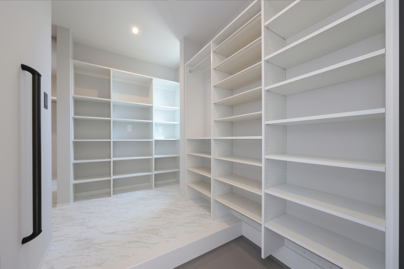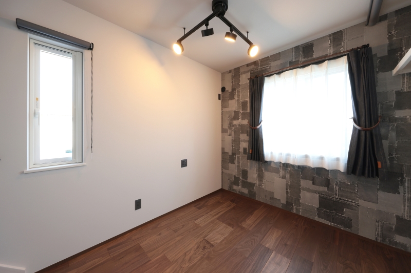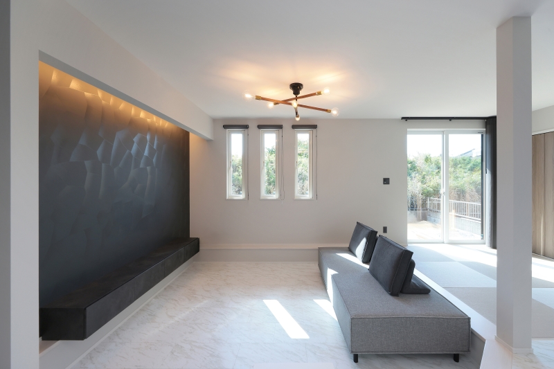 照明やクロスの使い方がとても上手な施工事例です。ペンダントライトや間接照明が空間に立体感を与え、モノトーンの花柄アクセントクロスが上質な雰囲気を演出。リビングには家族がくつろげる畳コーナーを設け、隣接するランドリー室の横には使い勝手の良いファミリークローゼットを配置。さらに小屋裏収納もあり、見た目と機能性を両立した快適な住まいです。