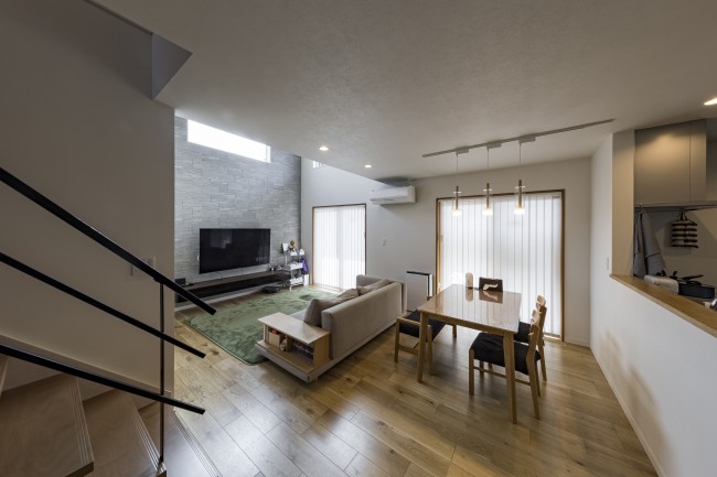 キッチンから一直線に延びるリビングダイニングで、各々の時間を愉しみながらもどこにいても家族を感じる事ができます。