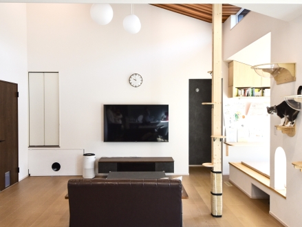 家の中心ともいえるリビングには家をささえる柱があります。柱には猫ちゃんのステップを設置し猫ちゃんが活発に遊べるキャットタワーをオリジナルで設置しました。