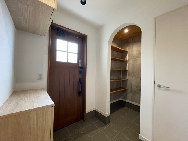 可愛らしい玄関ドアを開けると、まるでカフェに入ったかのような空間。アーチ壁をくぐると収納力抜群なシューズクローク。ドアがないオープンスタイルにする事で、両手で荷物を抱えている時や、家族が行き交う朝の時間でも、動線がとてもスムーズに◎